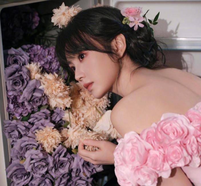 只是鲜花的存在感没有刘亦菲的满天星那么强,但也衬得五官更精致,像极了花仙子!